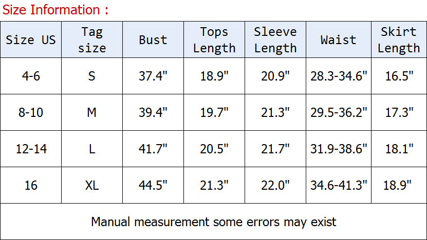 d) 4 Sizes optional, S=4-6, M=8-10, L=12-14, XL=16, please refer to our measurements