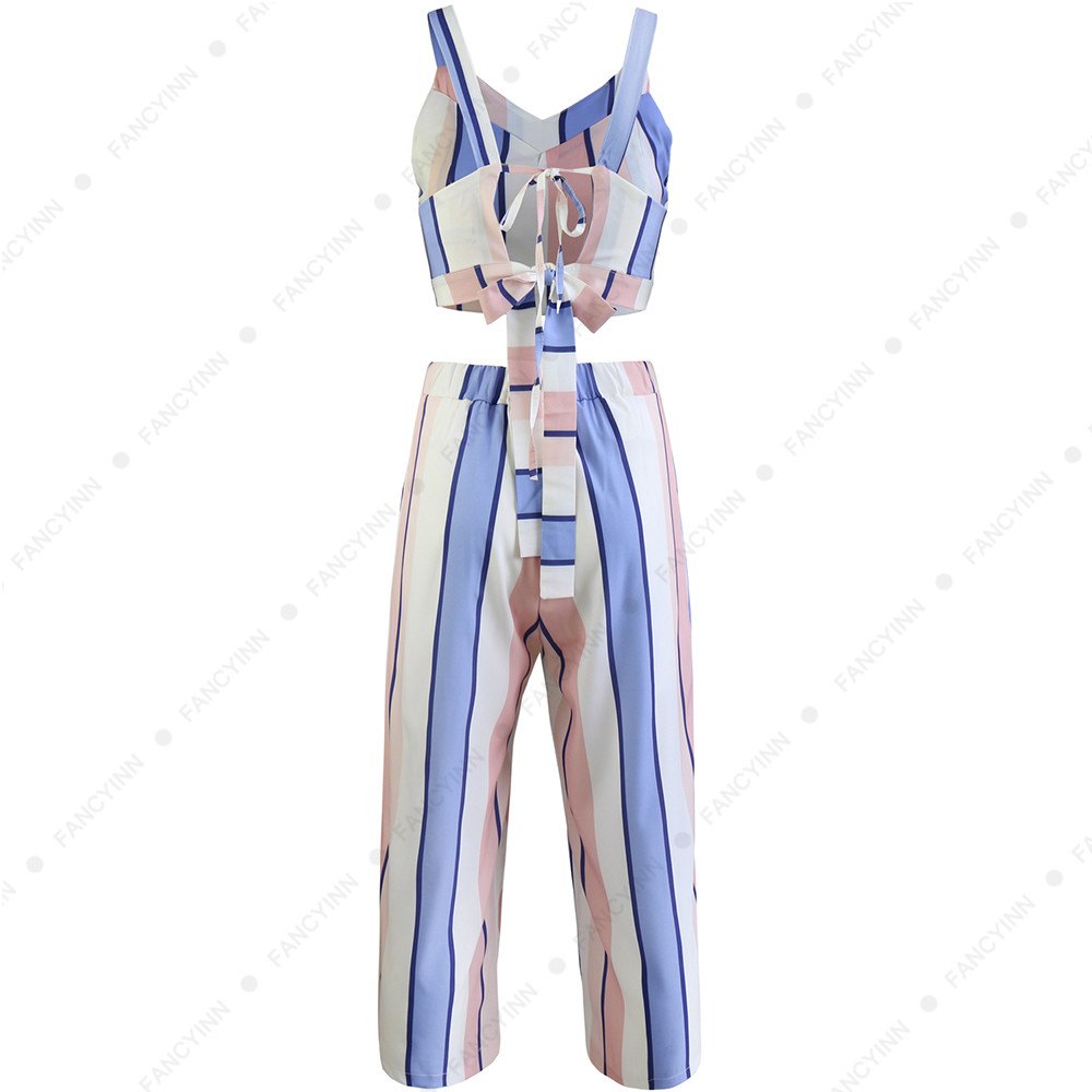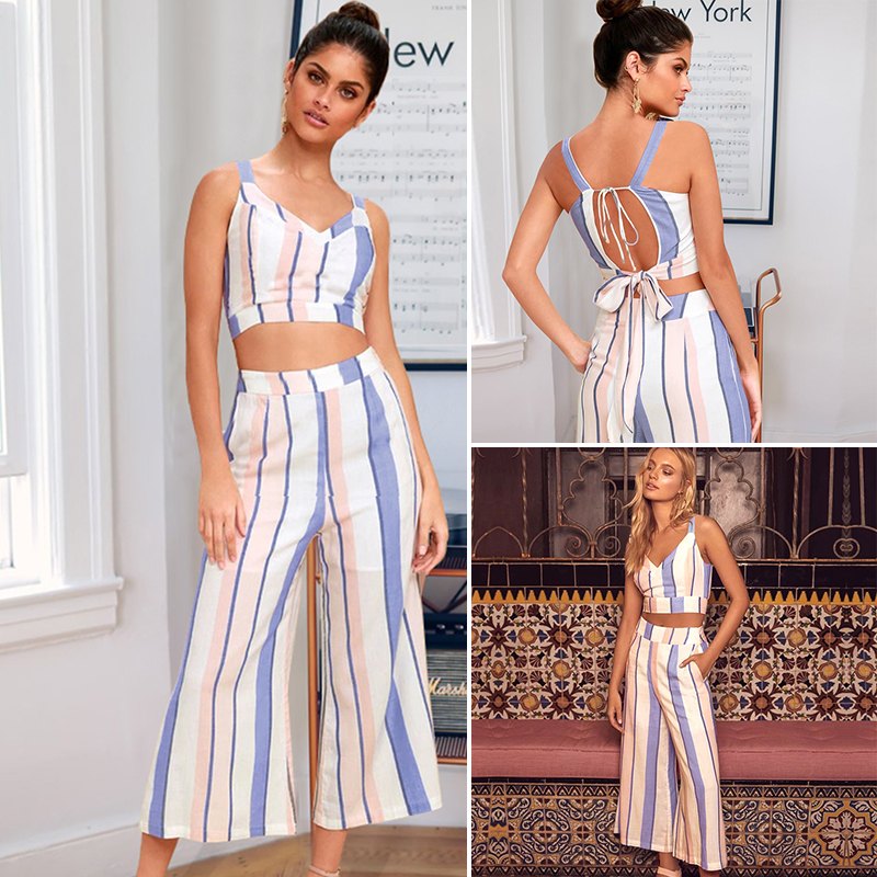 Women 2 Piece Striped Outfits Tie Back Crop Cami Top Wide Leg Pants 2 Pcs Set