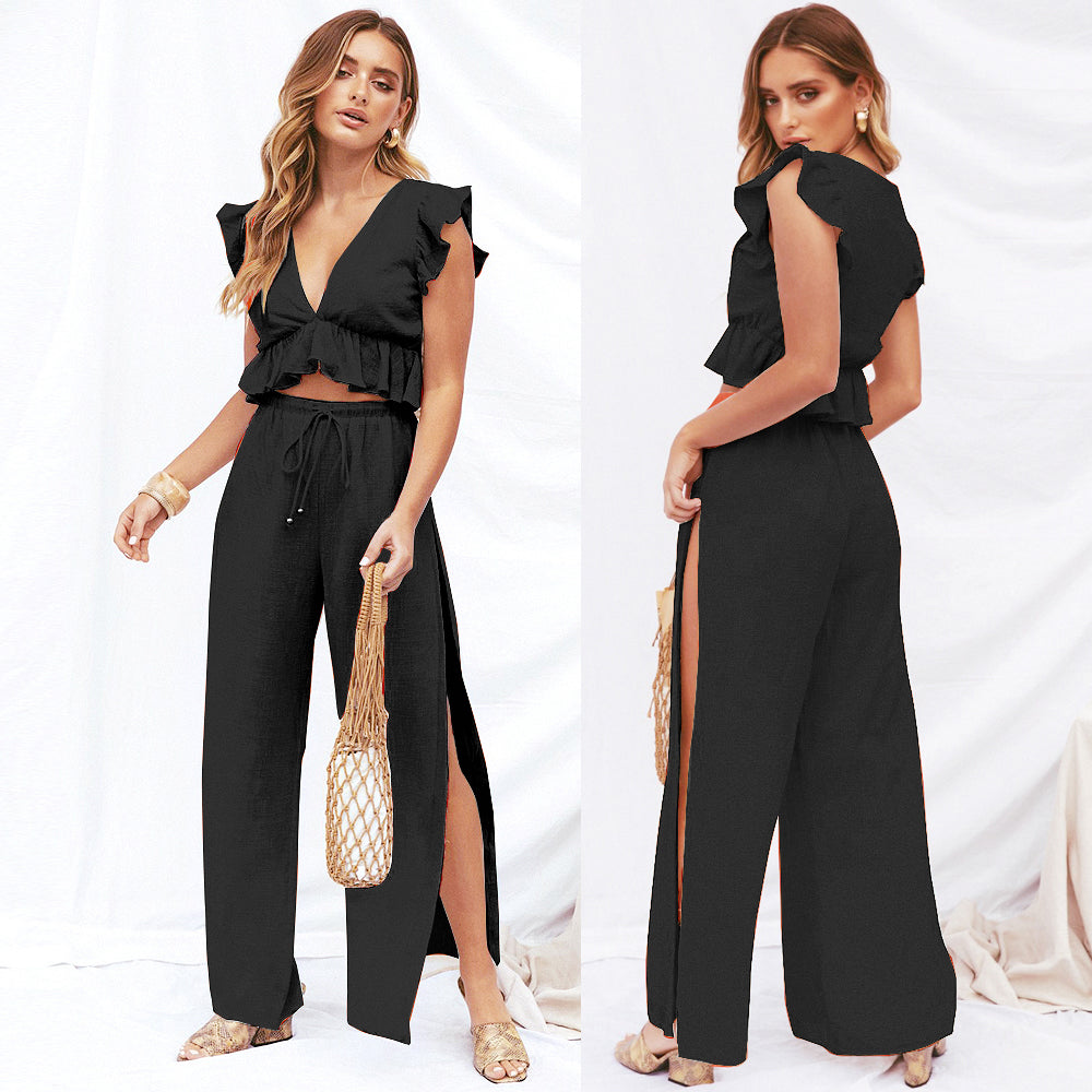 ★★★ Split pants are all about relaxed, the resort feels! made from a super lightweight fabric, high waisted style, featuring an elasticated waist with drawstring, gold bead details, wide legs, and full length splits at sides.